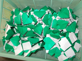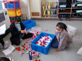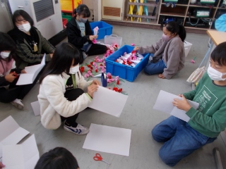 先日、各学年で作った折り紙花・茎・葉などを6年生が組み立てています。