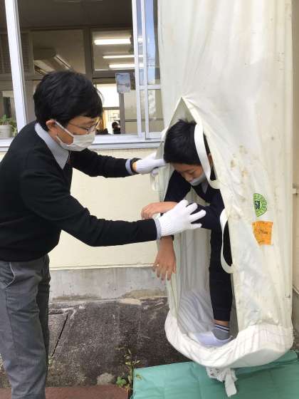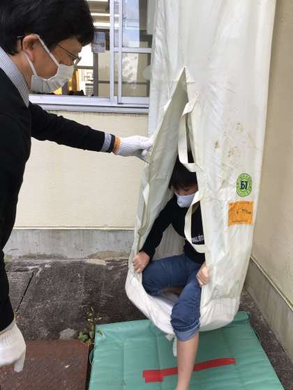 5年生は、救助袋(直下式)体験を行いました。