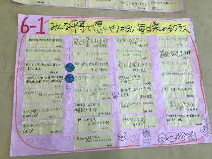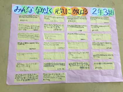 まず、各クラスで話し合って決めたクラスの「なかよし宣言」の発表をしました。