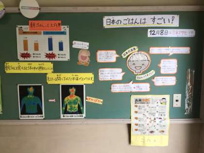 栄養教諭の坂井先生が、朝食の大切さについての掲示物を作りました。
