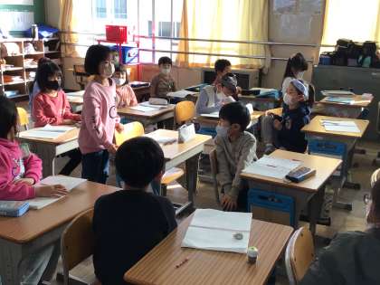 子どもたちは、文章中の「まとめて」「みんなで」など、計算に関わる言葉を見つけて足し算か引き算かを考えていました。