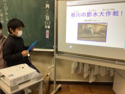 今朝は、2年生の教室で、節水についてパワーポイントを使って伝えていました。