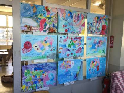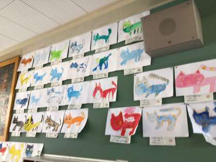 1年生は「わたしはあかねこ」、2年生は「にじいろのさかな」の本の絵を描きました。