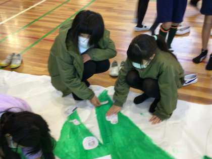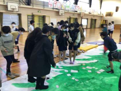 縦割り班で作ったクリスマス飾りをツリーに飾りました。