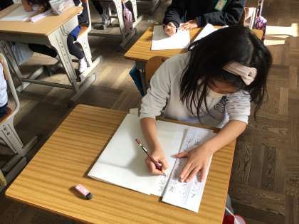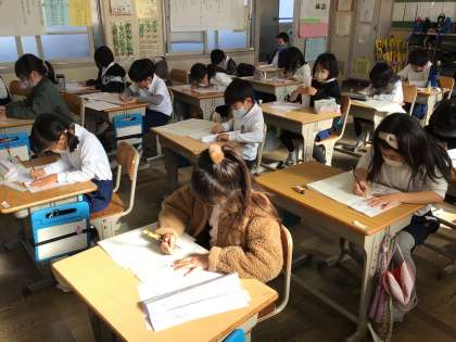 2年生が、書初め大会に向けて書き方の練習をしています。
