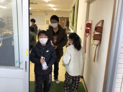 部屋の前には、消毒係をしている児童もいます。