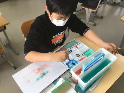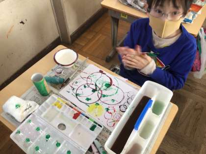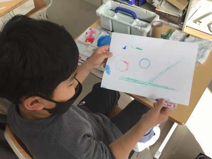 トイレットペーパーの芯や紙皿の切れ端で形を作ったり、ブラシを指で弾いて色を散らしたり、工夫してつくっていました。「みてみて ハートの形」「お星様みたい」など、楽しんでいました。