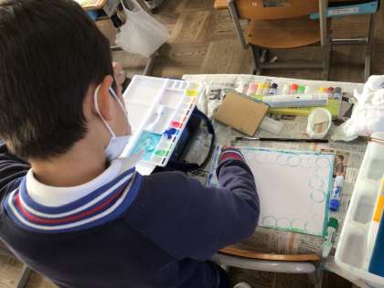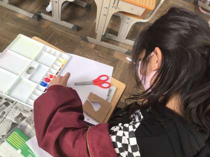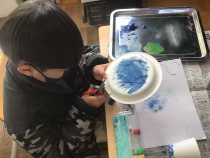 トイレットペーパーの芯や、紙皿の切れ端などで形を作ってスタンプを押しました。