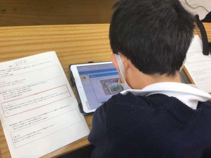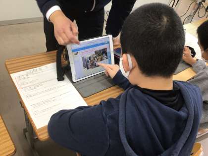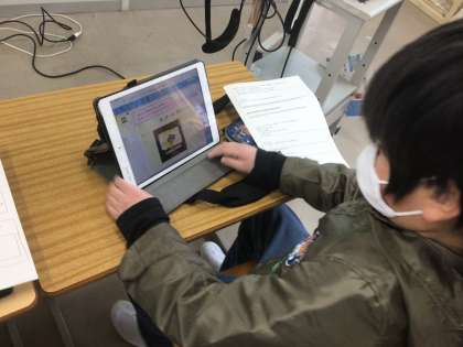 学習用タブレットの発表ノートを使って、写真を撮ったり内容をまとめたりしています。