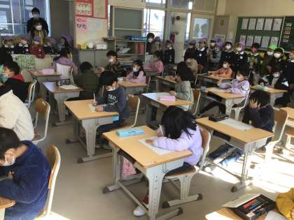 1年生がタブレットを使って学習をしたり、1年生の1年間について学んでいるのを真剣に見ていました。4月に入学してくるのが楽しみです。