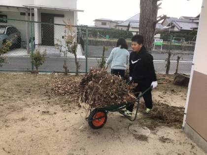 最近は、運動場の枯葉や枯れたので切った枝などを大量に一輪車で運んでいます。