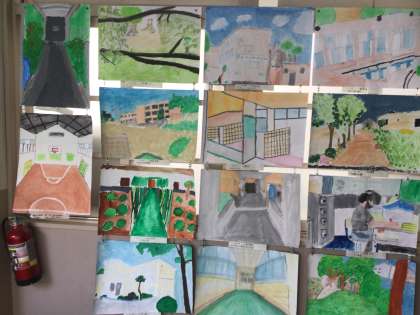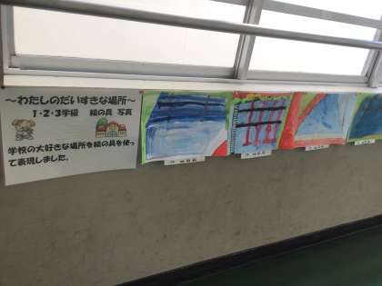 子どもたちが、学校の中のお気に入りの場所を絵に描いたり写真に撮ったりして、校内に掲示しました。子どもたちはそれぞれ、体育館や遊具、思い出の木などを作品にしていました。