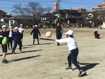 5年生の体育の学習で、ソフトベースボールを始めました。