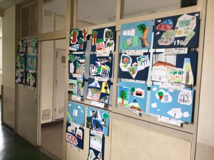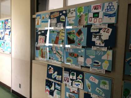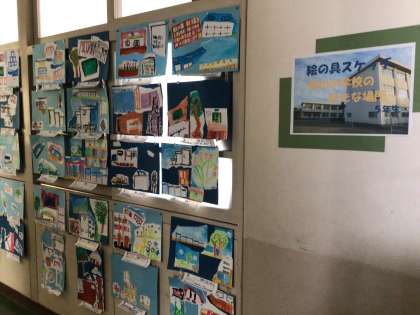 子どもたちが根川小学校創立150周年を記念して、学校の風景を描きました。