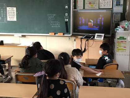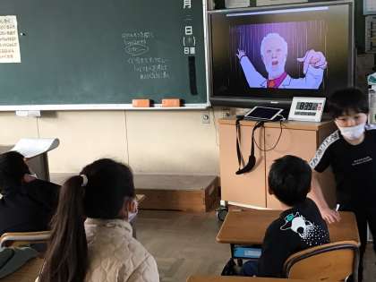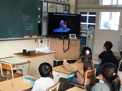 体育館で実際に跳ぶ前に、教室で跳び箱のテレビ番組を見て、予習しています。
