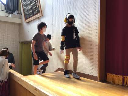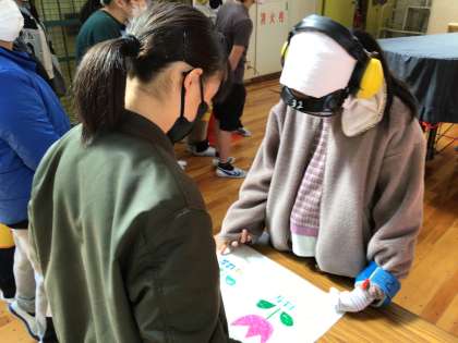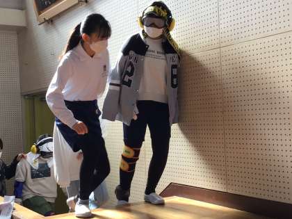 目が霞んだ状態に見えるゴーグルをつけたり、膝が曲がらないサポーターをつけたりするなど、高齢者疑似の格好をして、活動をしてみました。