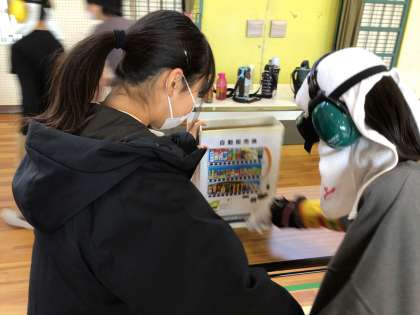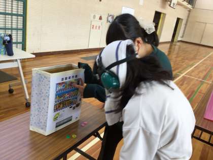 目が霞んだ状態に見えるゴーグルをつけたり、膝が曲がらないサポーターをつけたりするなど、高齢者疑似の格好をして、活動をしてみました。