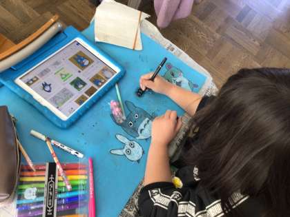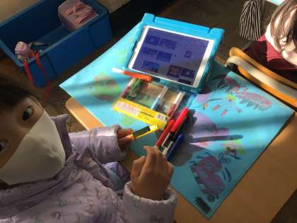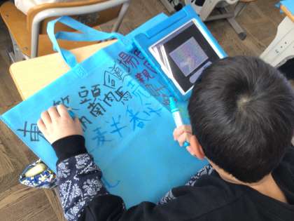 タブレットで、好きなキャラクターを検索して真似て描いたり、自分でデザインを考えて描いたりしていました。中には、今年習った漢字を書いている子もいます。