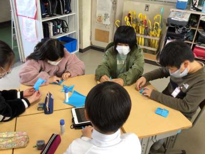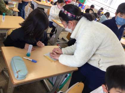それぞれの学年で、折り紙で花を作ったり、プレゼントを作ったり、飾りを作ったりと役割を決め、5年生が下の学年の子に教えています。タブレットでわかりやすく説明したり、机の近くに寄って優しく教えたりしています。