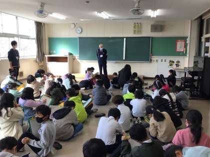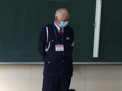 交通指導員の井上さんから、3年生が交通安全についてお話を聞きました。