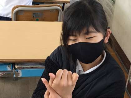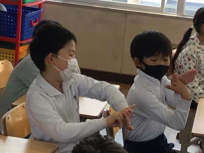季節に合った「さくら」の本や、果物の切り口をみせて「これな〜んだ」と、問いかける楽しい本も読んで下さいました。手を組んで、「何に見える?」と、問う絵本を見て、子どもたちは自分の手も同じように組んで、楽しんでいました。