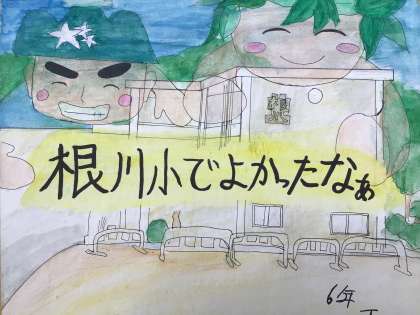 色紙には、校舎やせんだん君とネギ丼の絵と、「根川小学校でよかったなぁ」と書かれていました。
