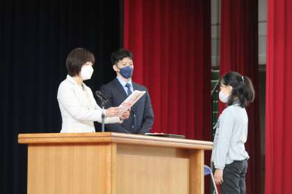 各学年の代表児童が、舞台上で修了証を受け取りました。