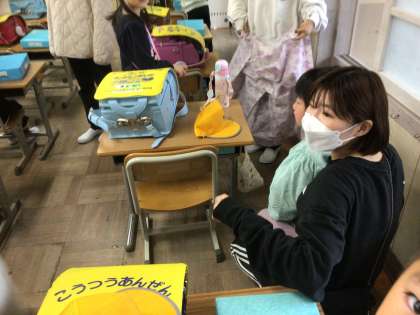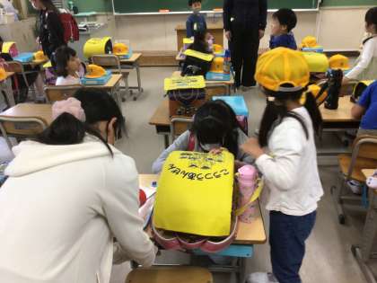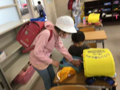 教室では、1年生のお支度を手伝う6年生の姿がありました。