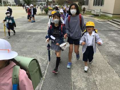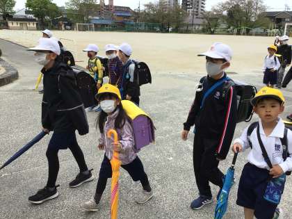 4月12日 1年生も、通学団での登下校に慣れてきました。 上級生に見守られて、登校しています