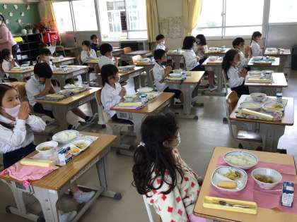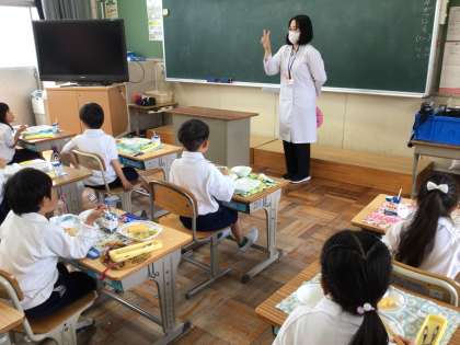 栄養教諭の先生が、給食の時間に1年生の教室を訪問しました。