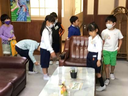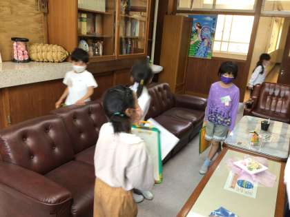 校長室に来た子たちは、「大きな金庫がある」「校長先生の写真がたくさんあるね。」など、驚いていました。2年生は「次は、保健室に行くよ」など、案内していました。