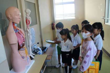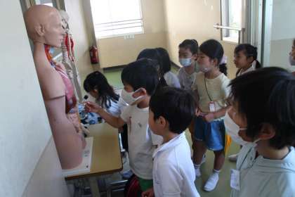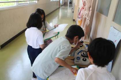 「図書室には、いっぱい本があるよ」「貸し出しの機械でぴっとしてから借りるんだよ」「理科室には人体模型があるよ」など、説明をしながらたんけんしていました。顕微鏡ものぞいてみました。