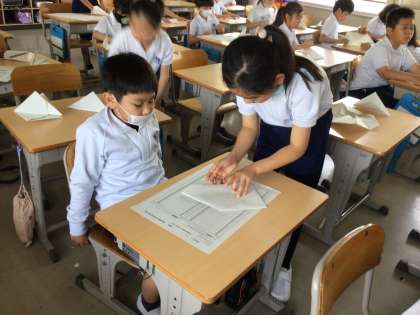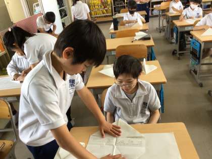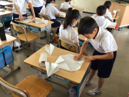 投げる力をつけるために、初めに、紙でっぽうを作ってスナップを使って投げる練習をしました。 次に体育館の壁に的作って、フォームを意識しながら、的当てをしました。