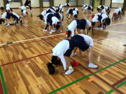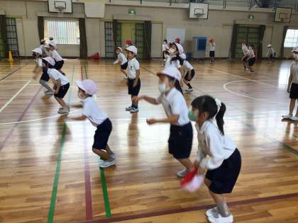 体を指示どおりに前後に動かしたり、友達とペアになって帽子取りをしたり、楽しみながら体を動かすことが出来ました。