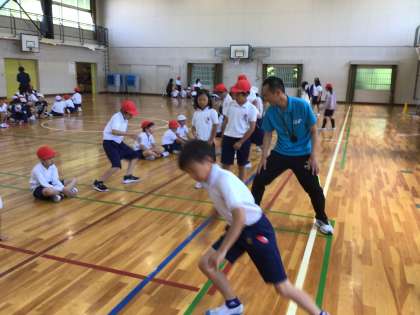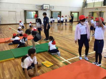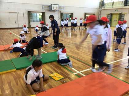 体育館では、反復横跳びや立ち幅跳び、長座体前屈、上体起こしをしました。