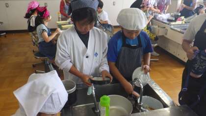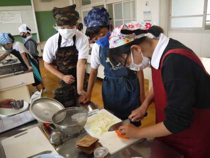 5年生が、来週のキャンプに向けて、家庭科でカレー作りに挑戦しています。