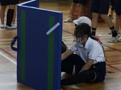 ドッジボールのコートに、跳び箱や簡易マットを置いて隠れ場所にしました。