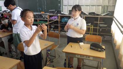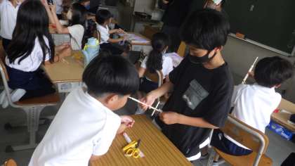 1年生が、おもちゃを作れなくて困っていると、6年生が優しく手伝ったり、ゲームをするのにみんなで盛り上がったりしていました。