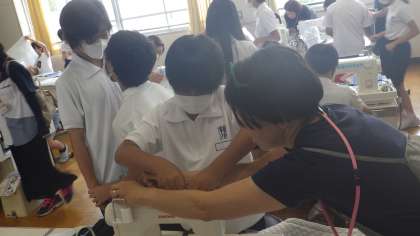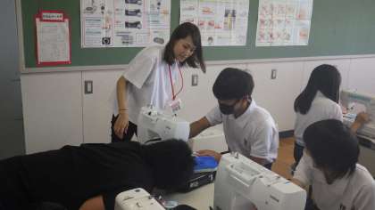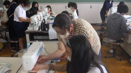 学校サポーターの方が、ミシンボランティアとして、家庭科の授業を手伝ってくださっています。ミシンの使い方がわからない児童に、一人一人丁寧に教えてくださいます。