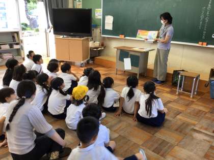 低学年も高学年も、みんな興味をもって真剣にお話を聞いています。