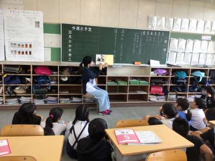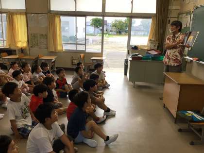 低学年も高学年も、みんな興味をもって真剣にお話を聞いています。