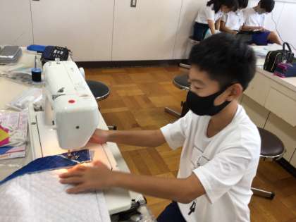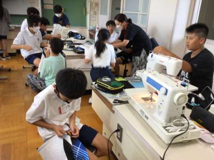 6年生は、家庭科の授業で、修学旅行に持っていくナップサックを作っています。ボランティアの方々もお手伝いに来てくださいました。