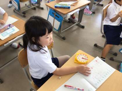 1年生が、算数で時計の学習をしています。「4時は?」「12時は?」という先生の問いかけで、針を動かしています。