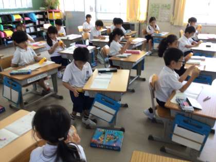 2年生がスピーチをしています。お友達のスピーチを一生懸命に聞いています。