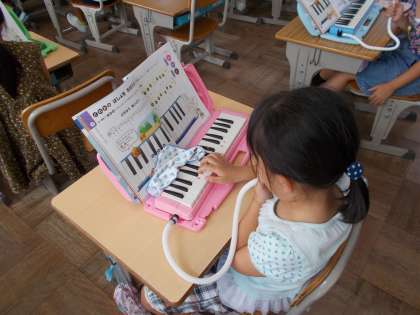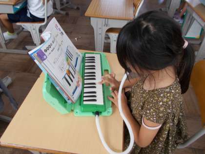 1年生が、音楽の学習で鍵盤ハーモニカの練習をしています。