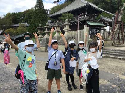 クイズラリーをしながら、班別活動を楽しんでいます。