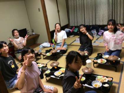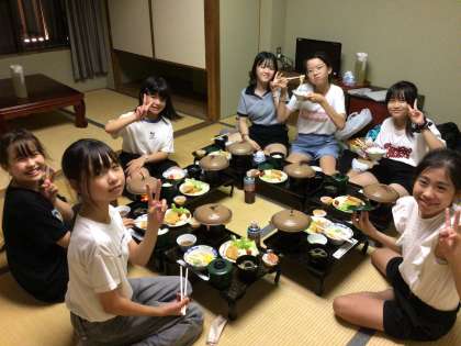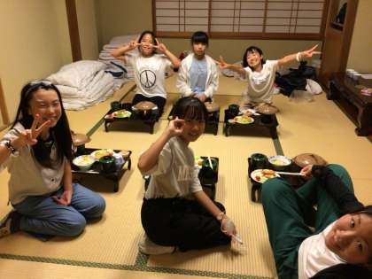 旅館での食事 「おいし〜い」「楽し〜い」 部屋ごとに、わいわい食べています。