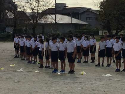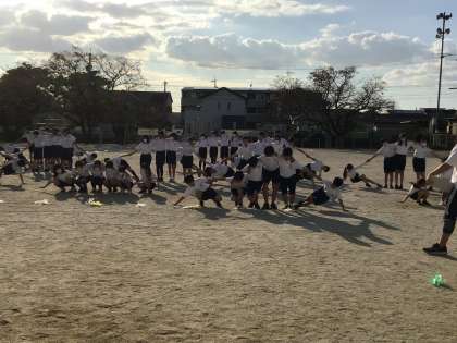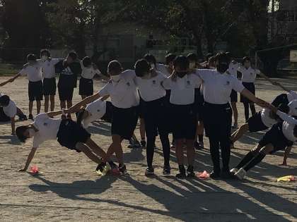 高学年が、運動場でスタンツの練習を始めました。