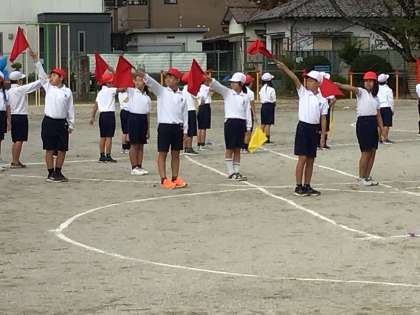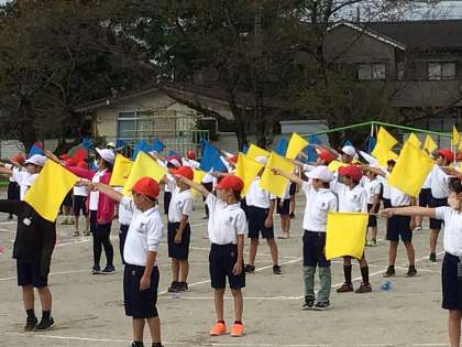 3,4年生は、小旗をもって演技する「フラッグダンス」を行います。まだ練習中で、間違えることもありますが、本番はかっこよくできるといいです。