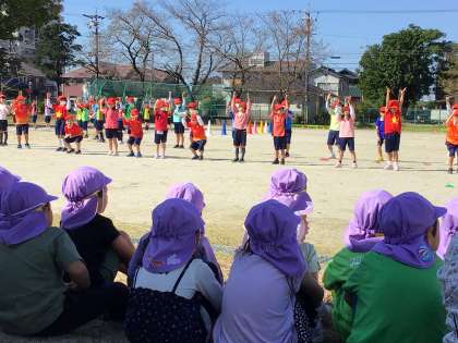 根川子ども園の園児さん達が、1、2年生の運動会の練習を見に来てくれました。